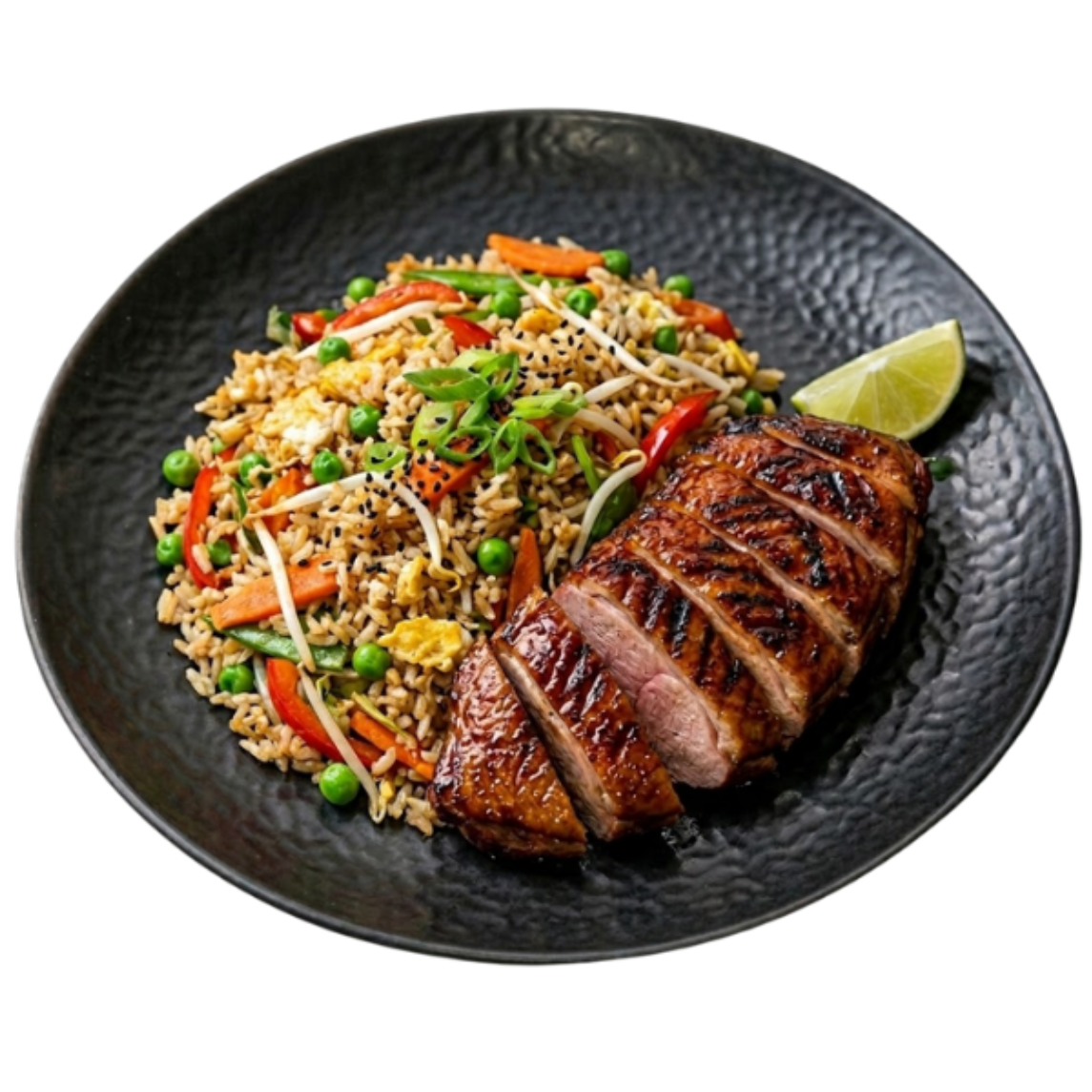 Gebr. Reis mit gegrillter Ente, Gemüse und Eier