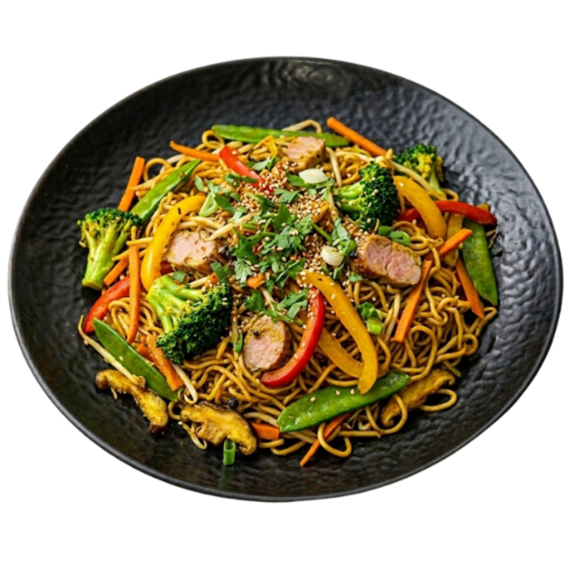 Gebr. Nudeln mit Schweinefilet, Gemüse und Curry