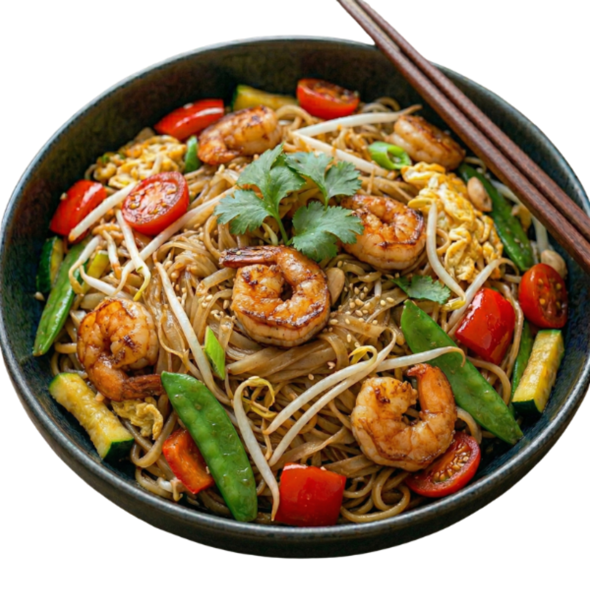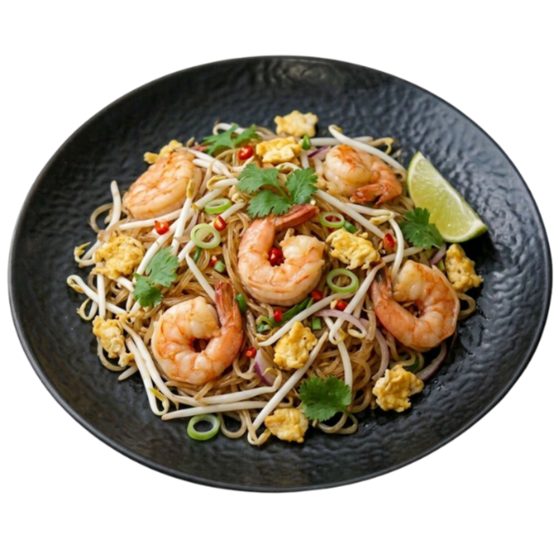 Gebr. Reisnudeln mit Garnelen, Sojakeimen und Eier