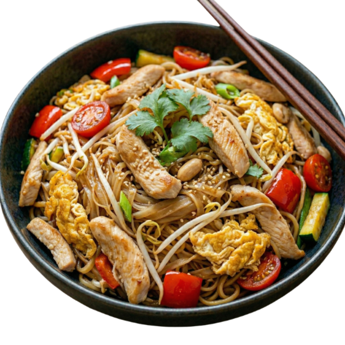 Gebr. Reisnudeln mit knusprigem Hühnerfleisch, Gemüse und Eier