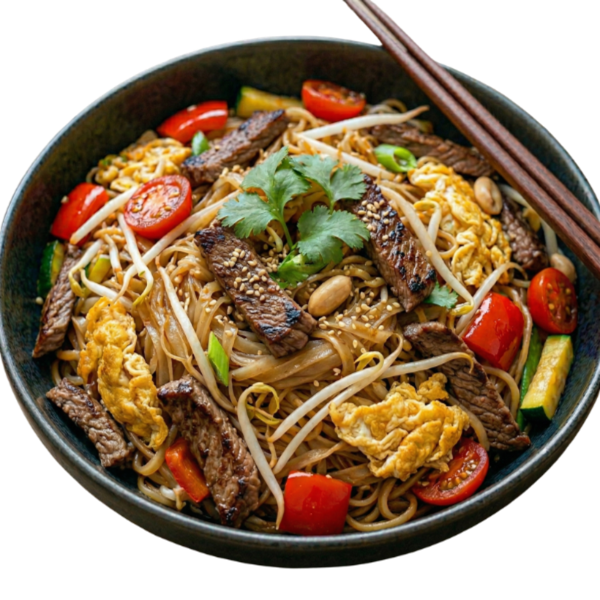 Gebr. Reisnudeln mit Rinderfilet, Sojakeimen und Eier