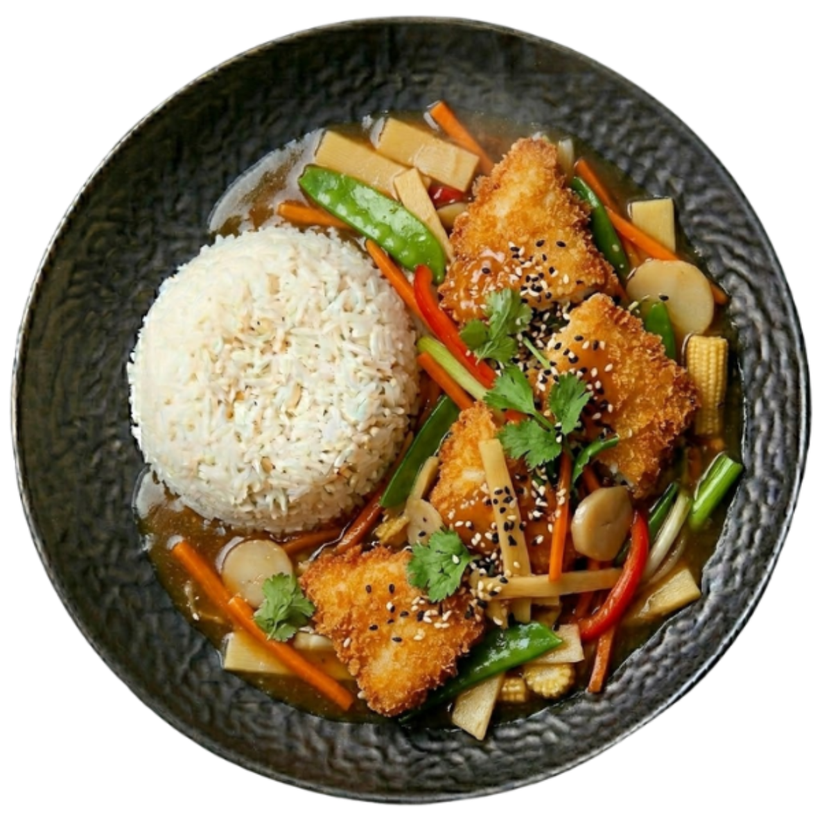 Fischfilet (paniert) Chop-Suey-Sauce mit verschiedenen Gemüse dazu eine Portion Reis