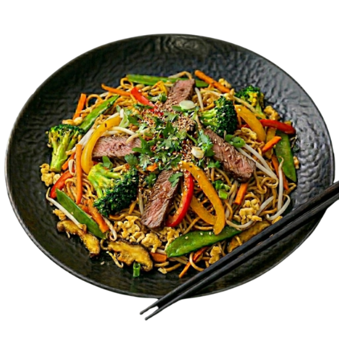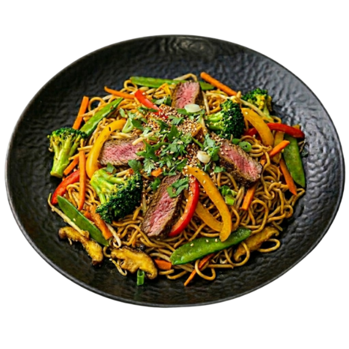 Gebr. Nudeln mit Rinderfilet, Gemüse und Curry