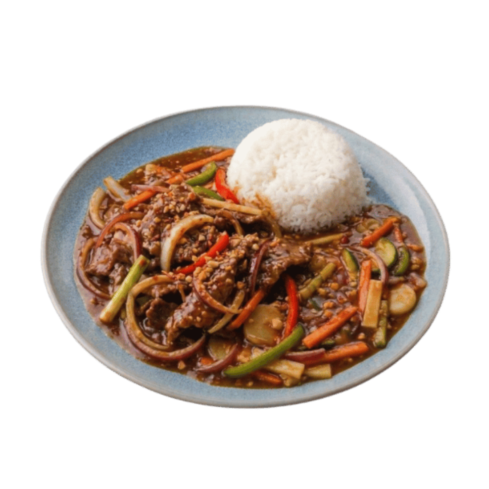Rinderfilet mit Zwiebeln und Paprika (Sauce) Szechuan dazu eine Portion Reis
