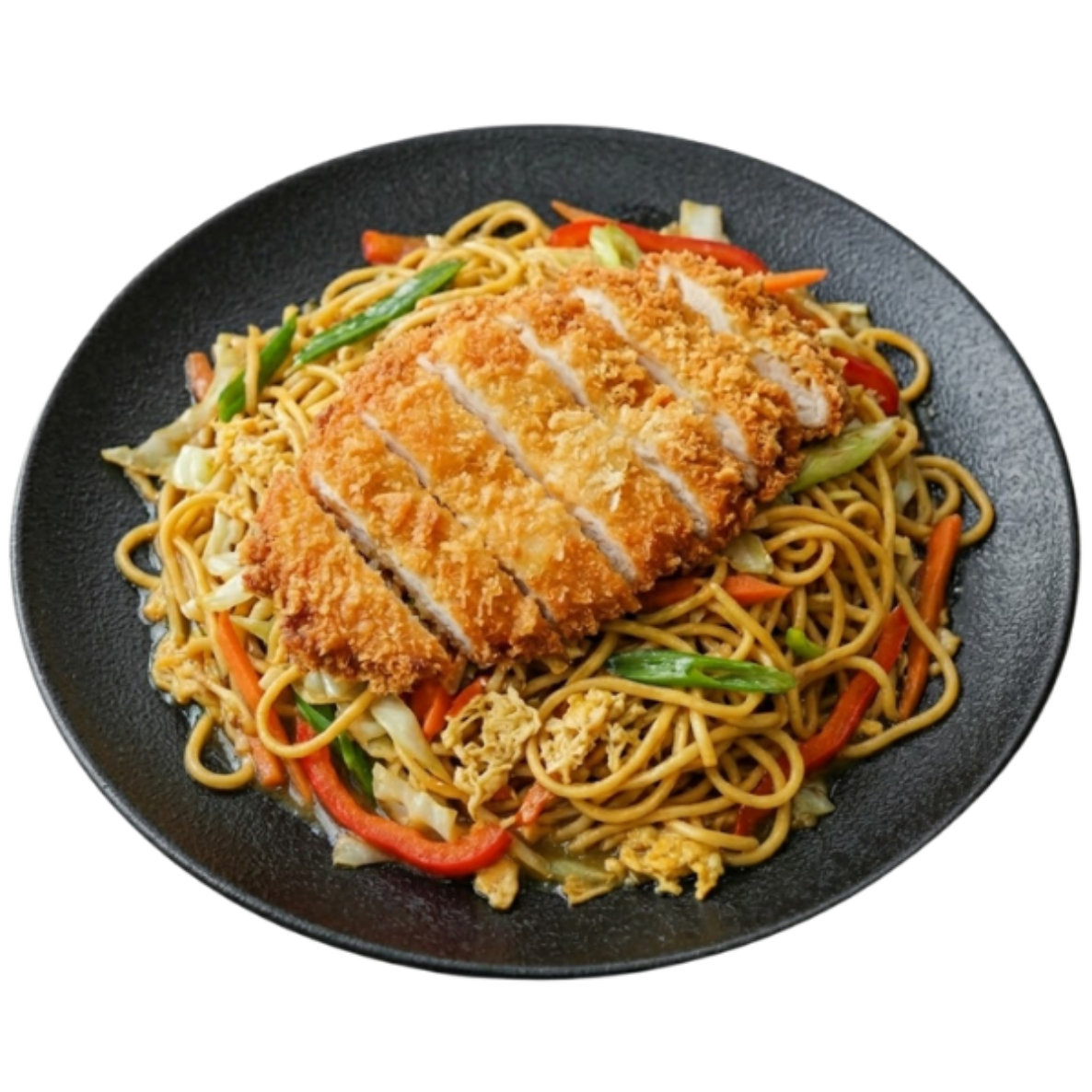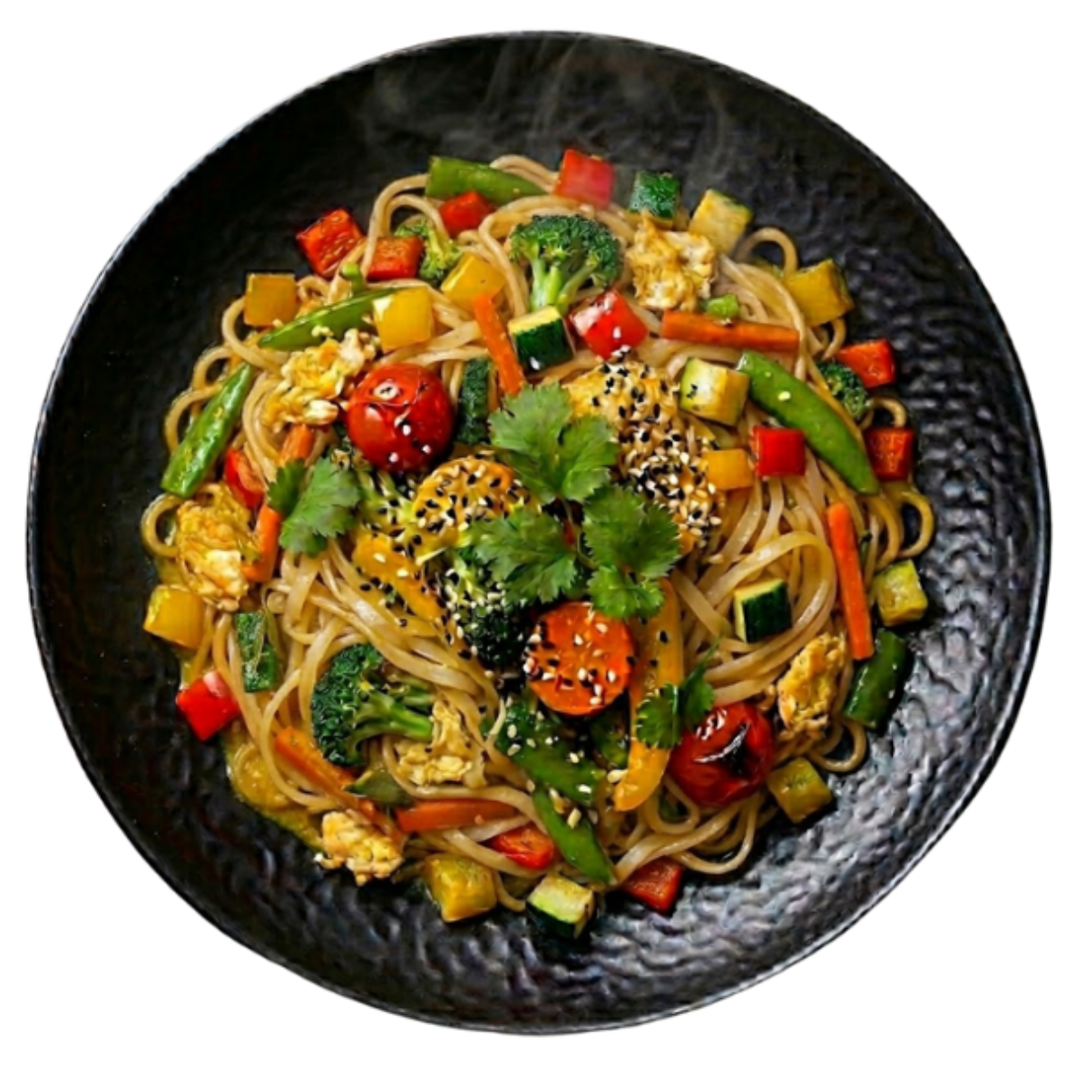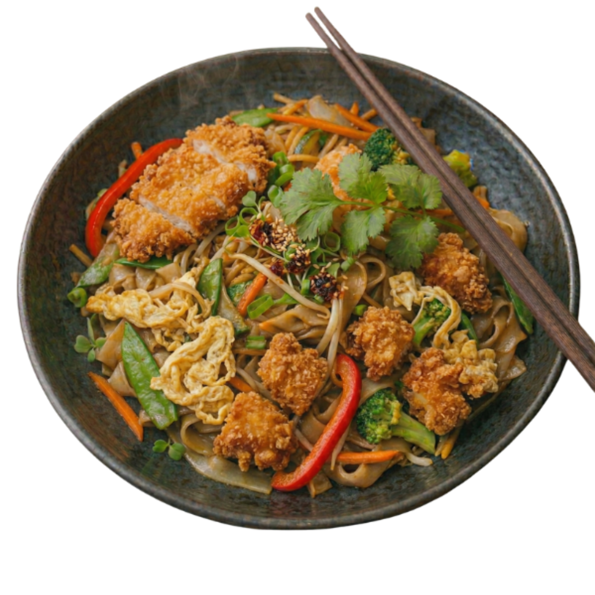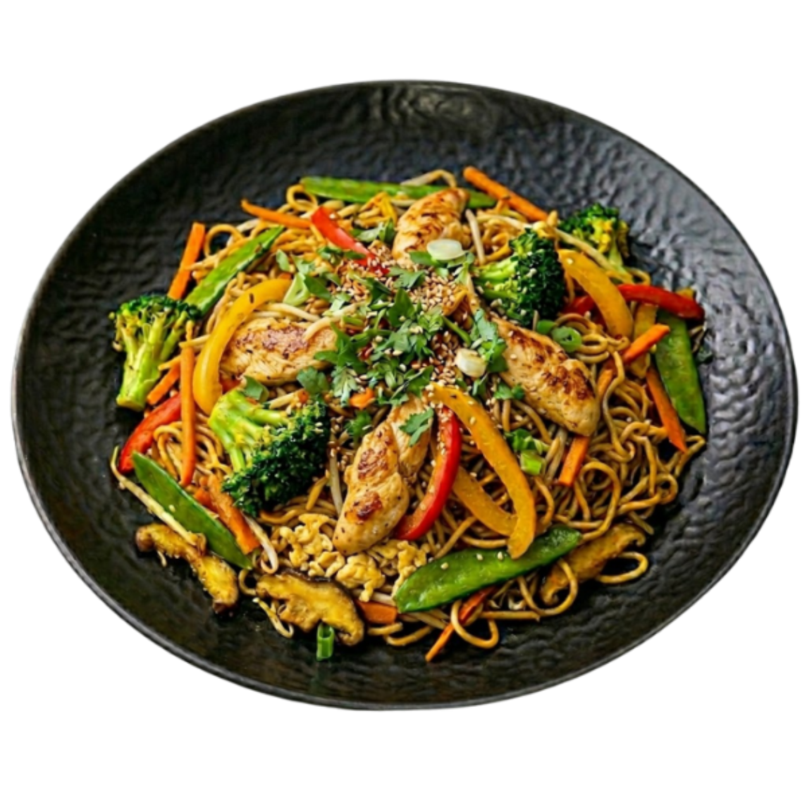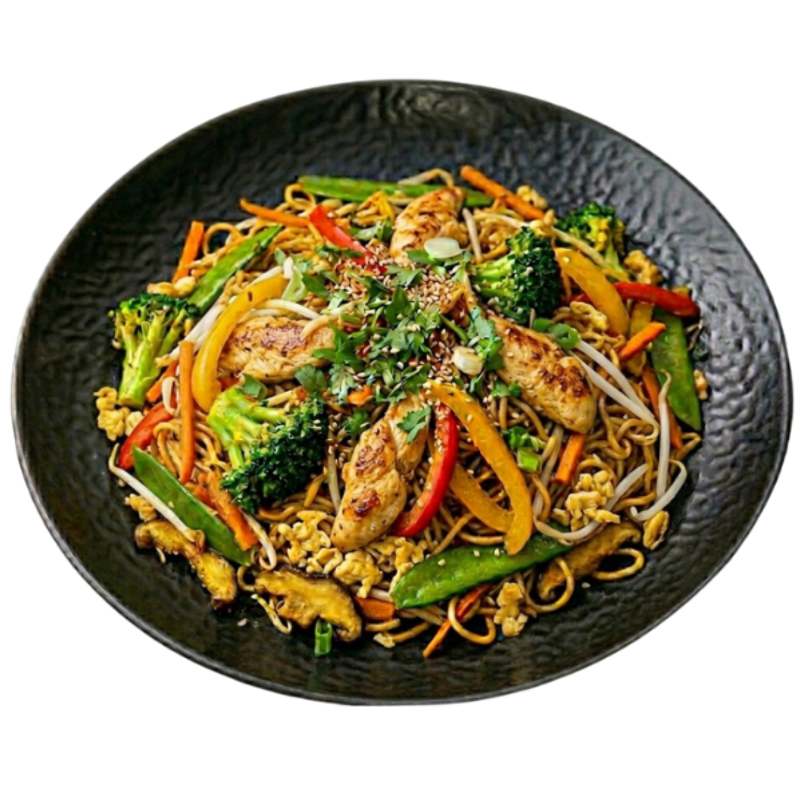 Gebr. Nudeln mit knusprigem Hühnerfleisch, Gemüse und Eier