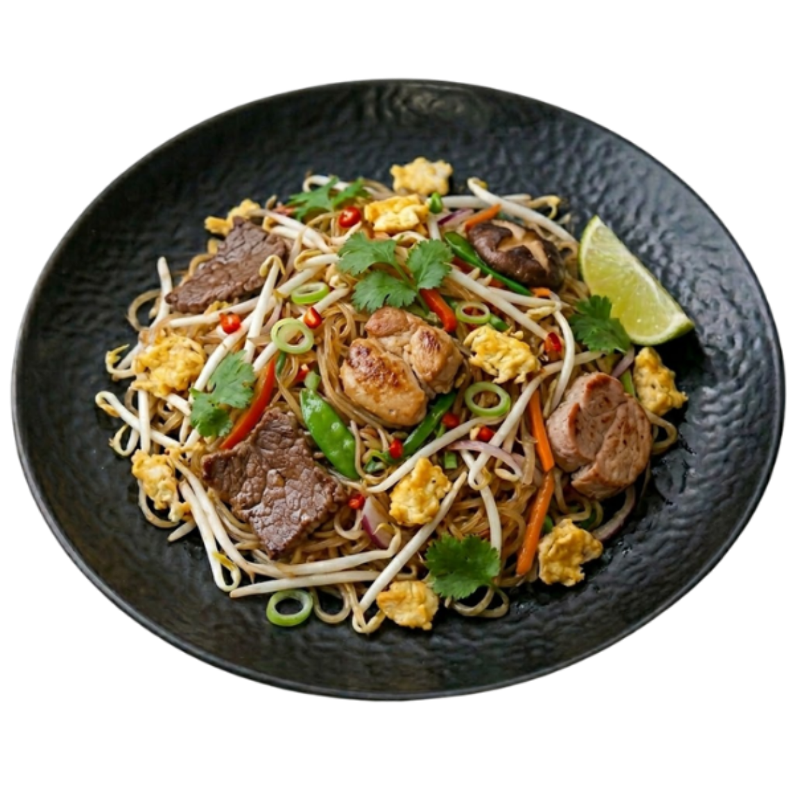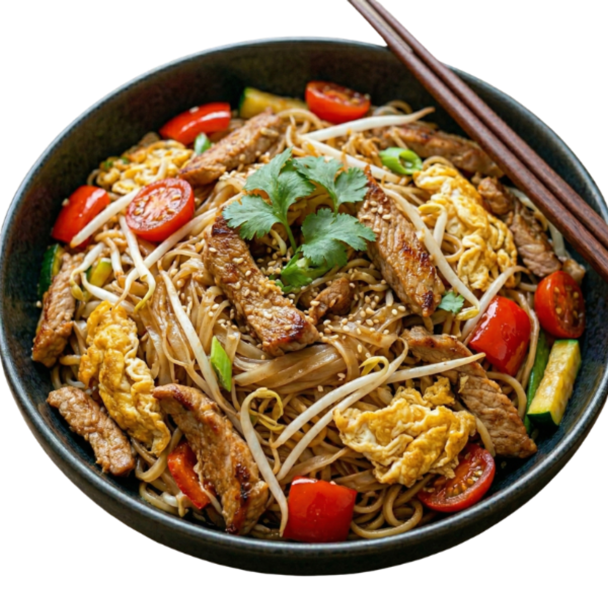 Gebr. Nudeln mit Rind-, Hühner-, Schweinefilet, Gemüse und Eier