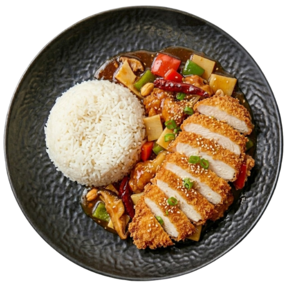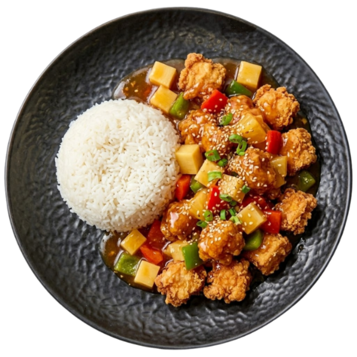 Ku Lu Yuk paniertes Schweinefleisch mit Aca & Süß-Sauer-Sauce dazu eine Portion Reis