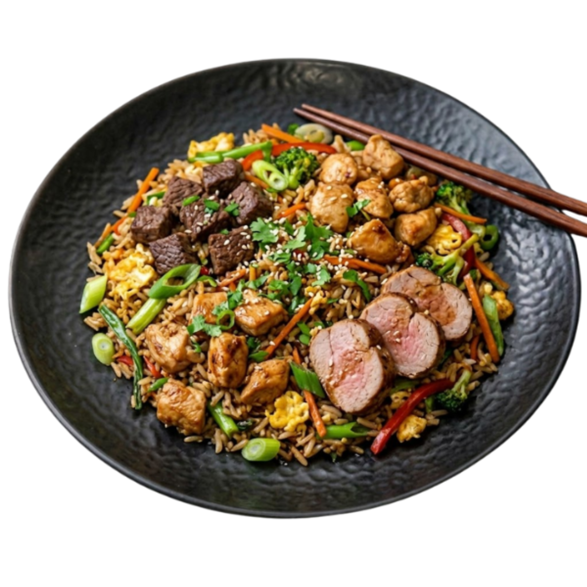 Gebr. Reis mit Rind-, Hühner-, Schweinefilet, Gemüse und Eier