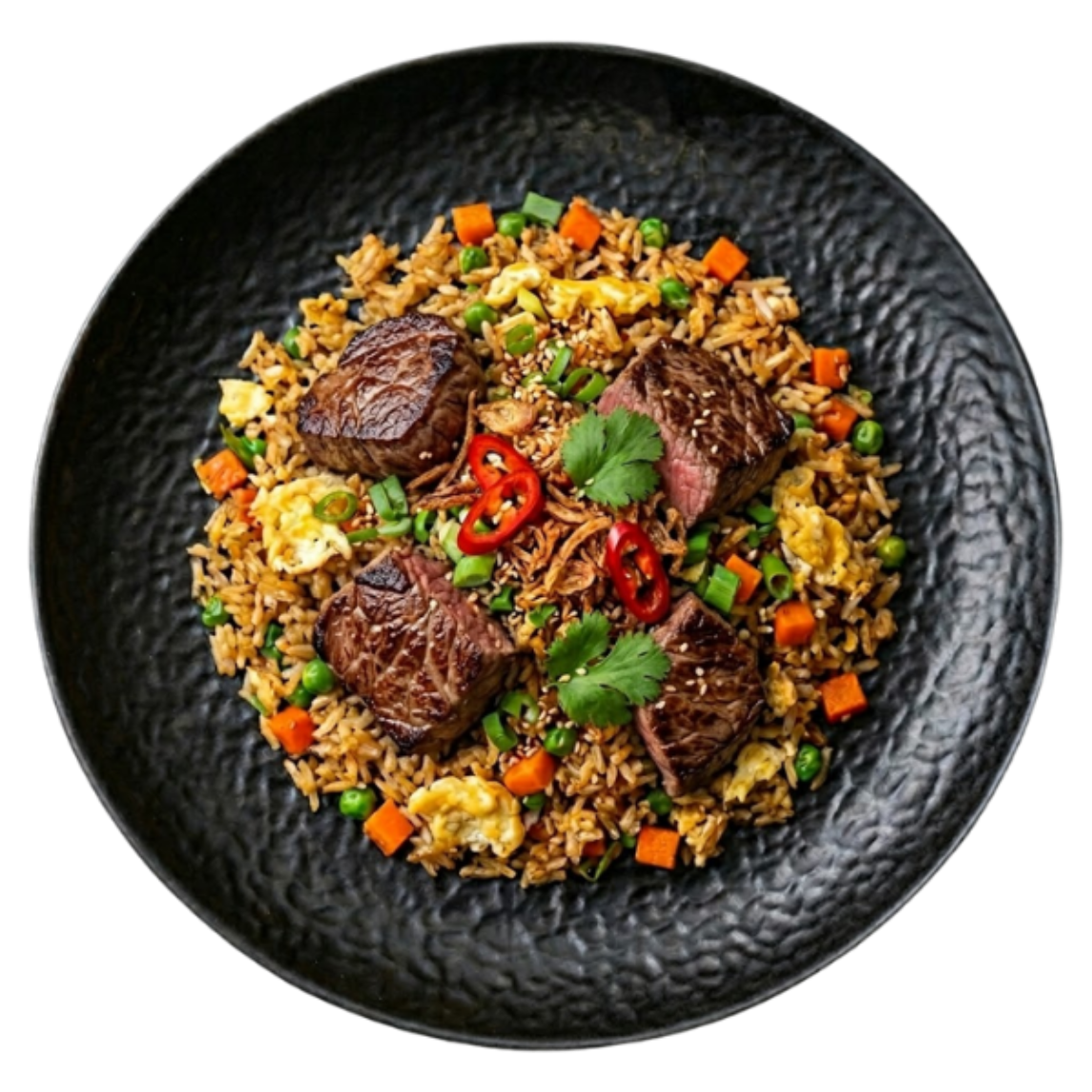 Gebr. Reis mit Rinderfilet, Gemüse und Eier