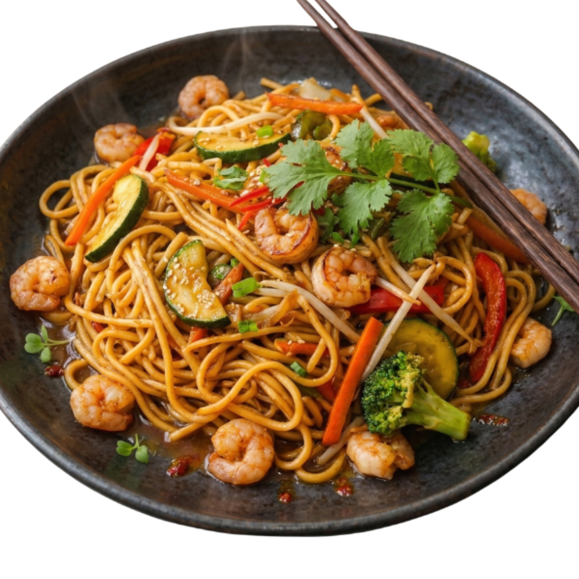 Bami-Goreng gebr. Nudeln mit Krabben, Hühnerfleisch, Schinken und Curry