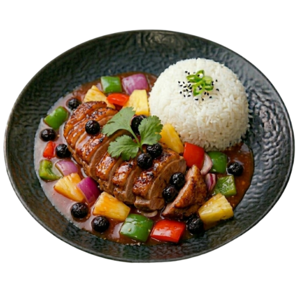 Gegrillte Ente mit Aca und Süß-Sauer-Sauce mit einer Portion Reis