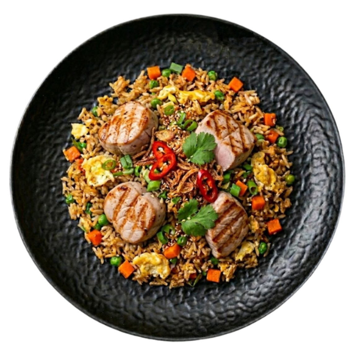 Gebr. Reis mit Schweinefilet, Gemüse und Eier
