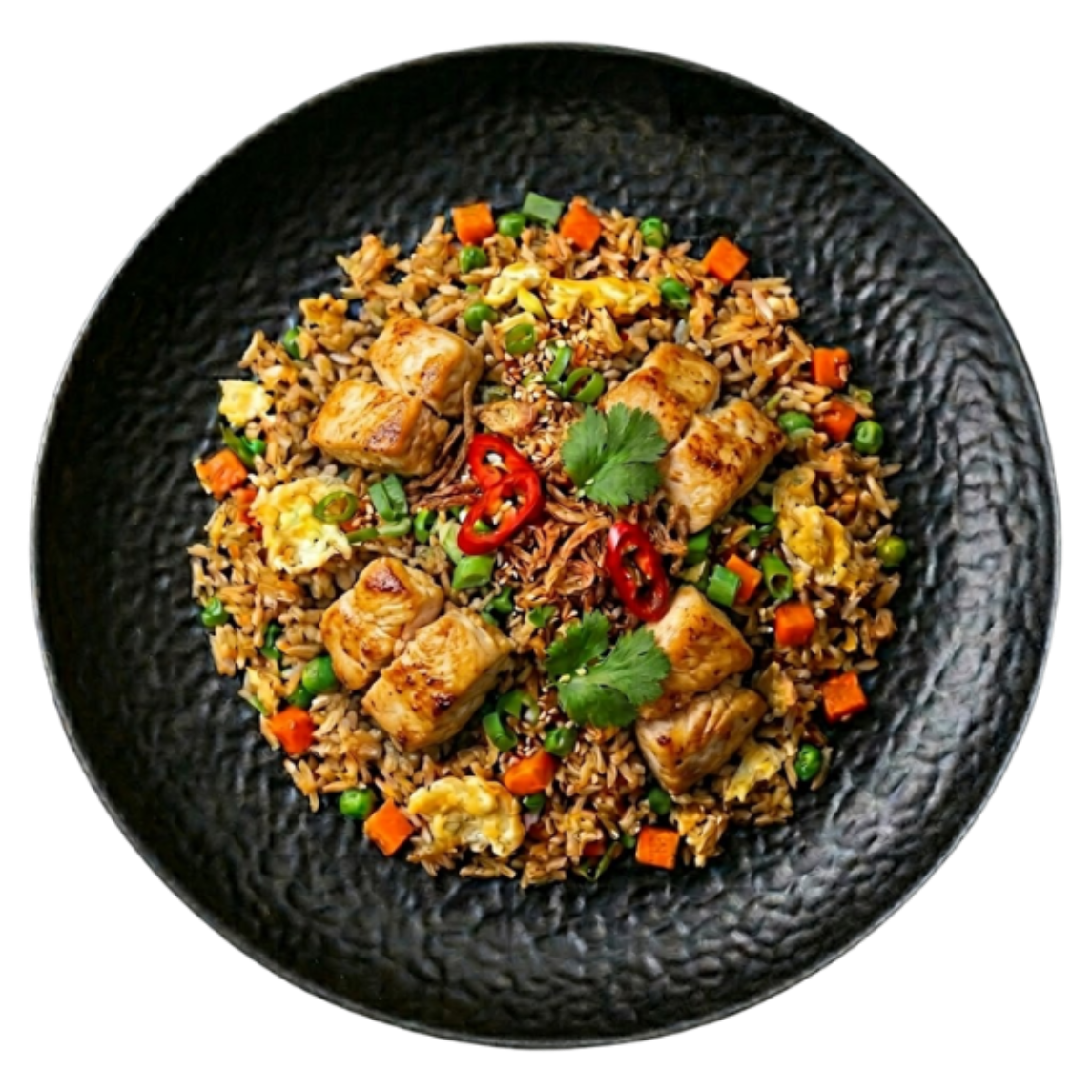 Gebr. Reis mit Hühnerfleisch, Gemüse und Eier