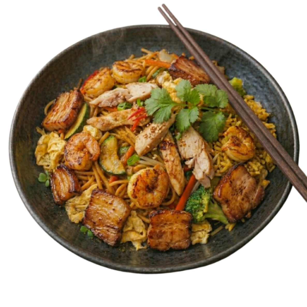 Gebr. Reisnudeln gebr. Reis mit Krabben, Hühnerfleisch, Schinken und Curry