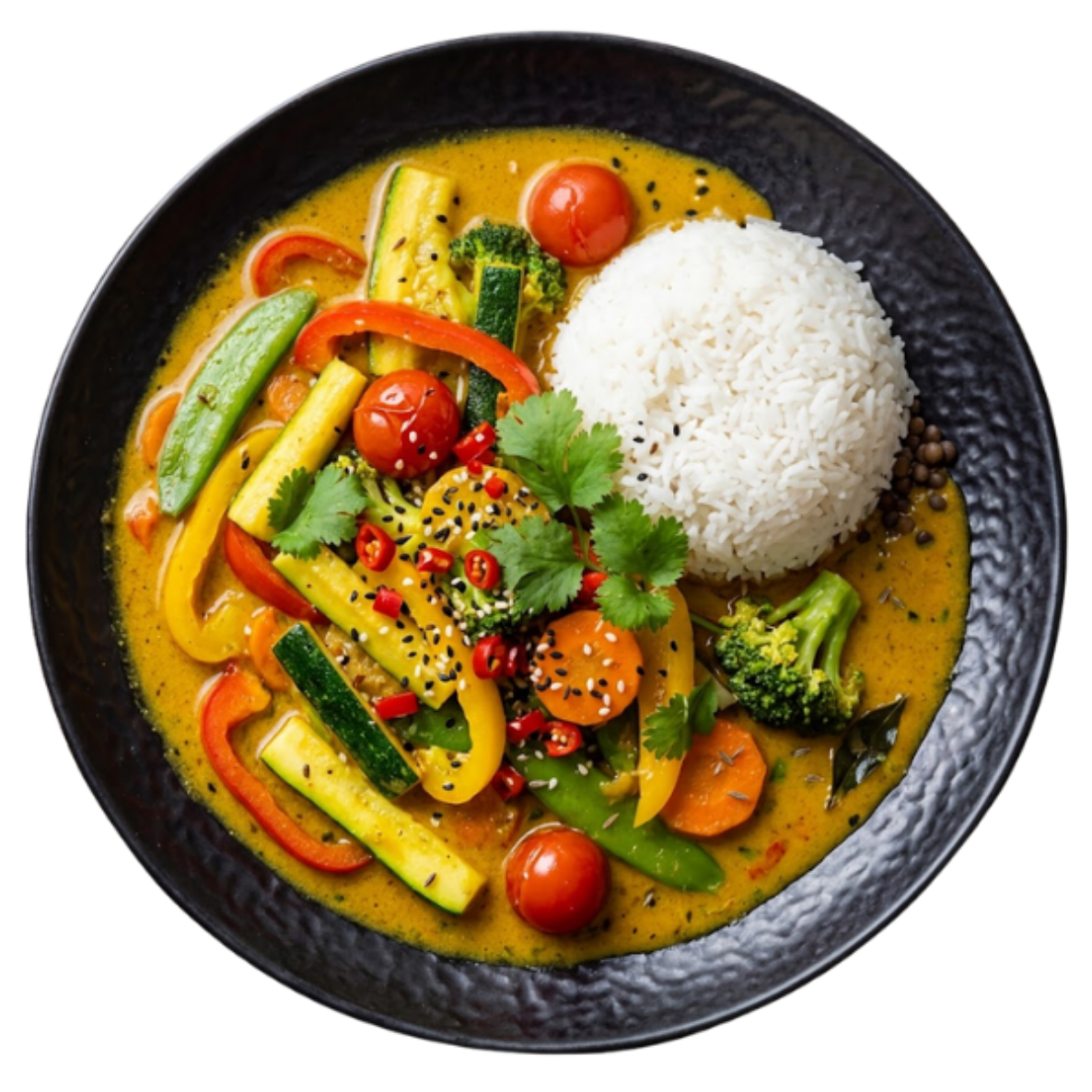 Gemüse-Teller mit Curry und verschiedenem Gemüse dazu eine Portion Reis