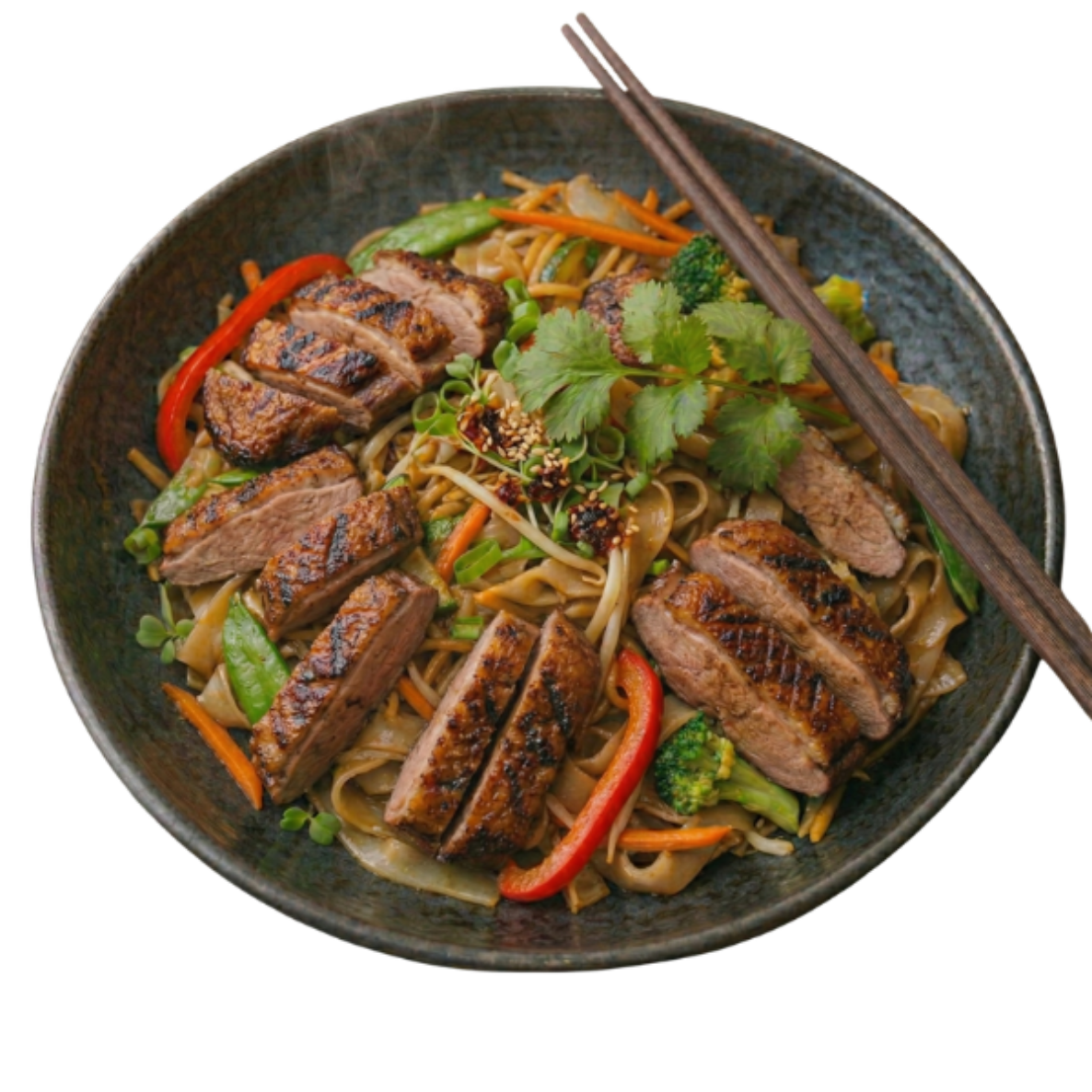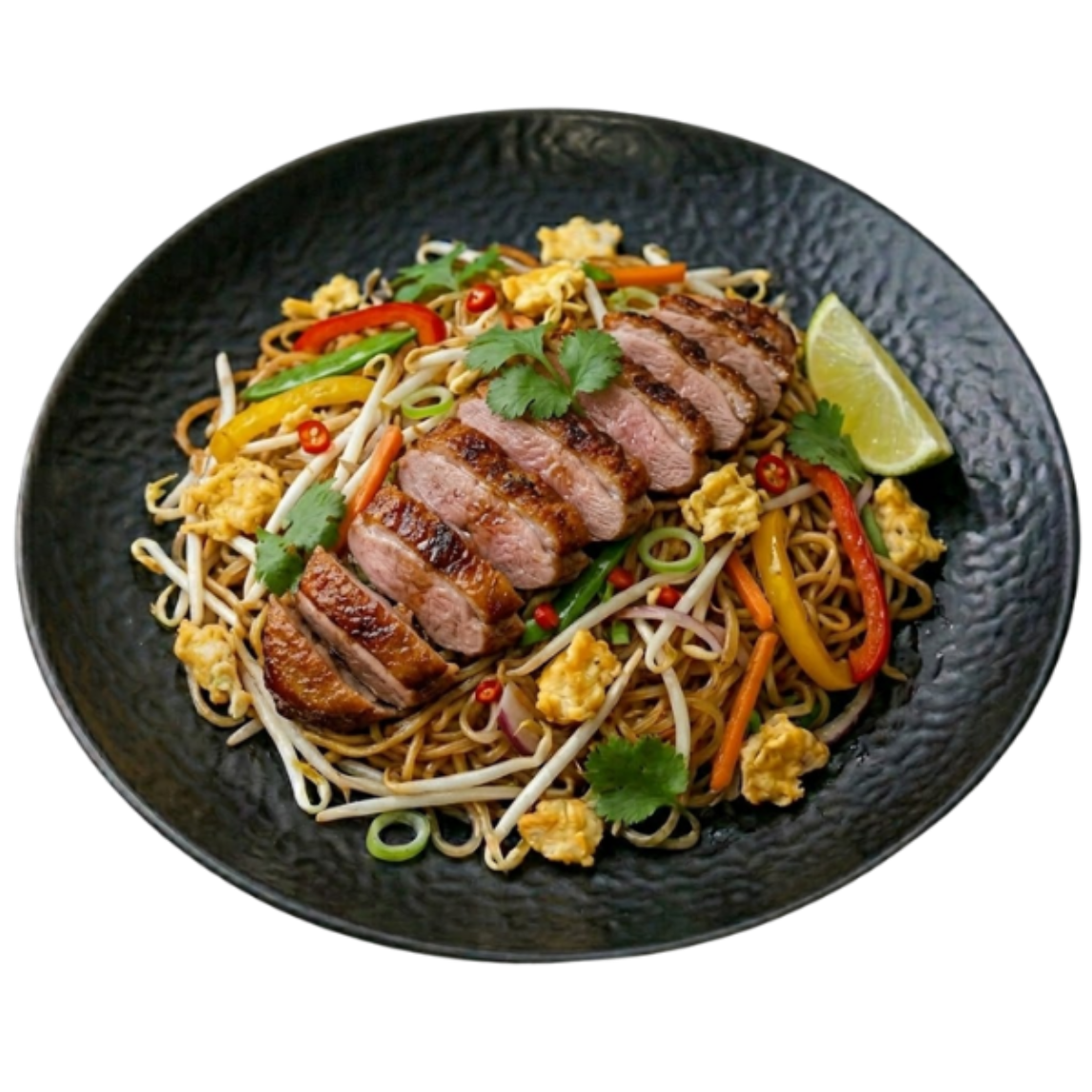 Gebr. Nudeln mit gegrillter Ente, Gemüse und Eier