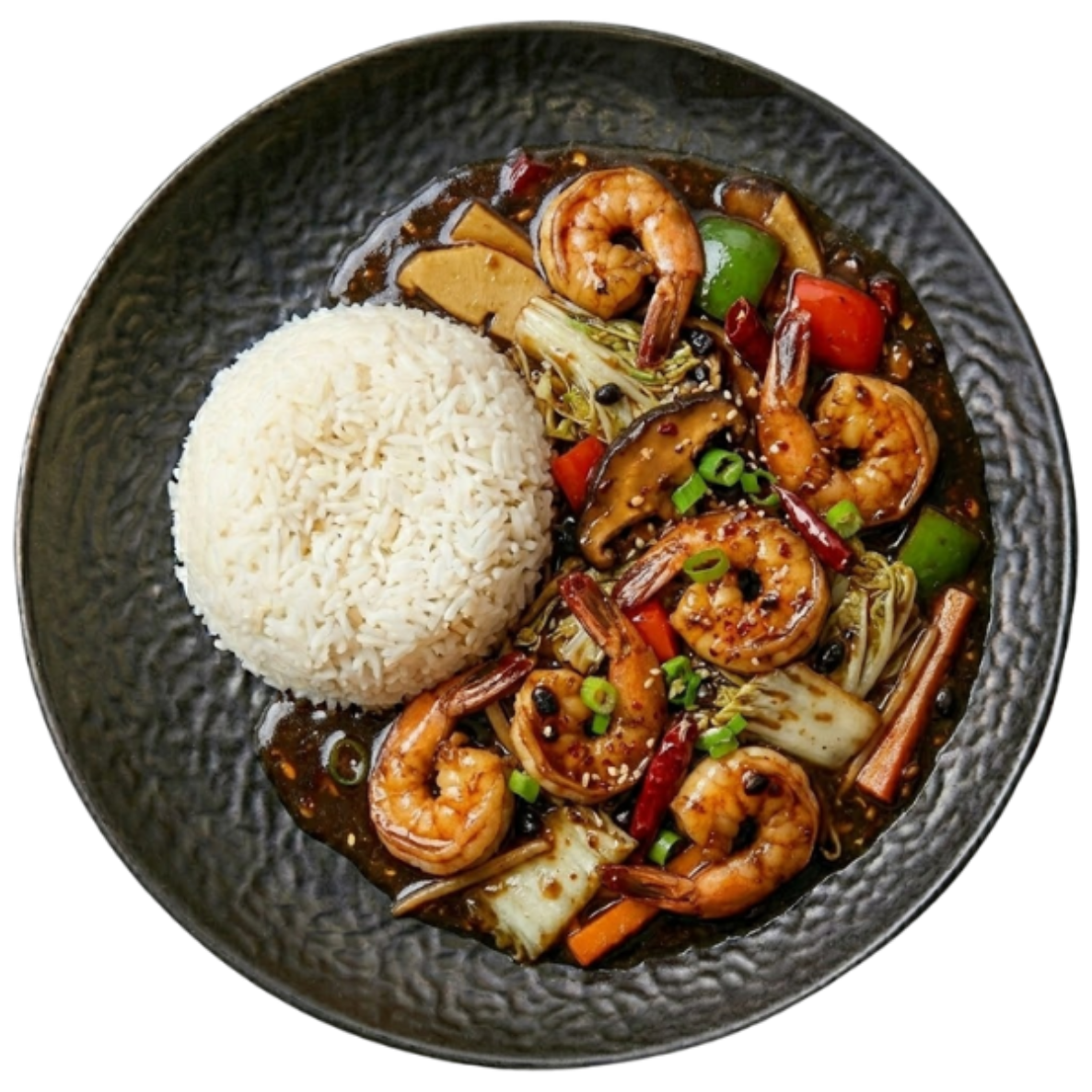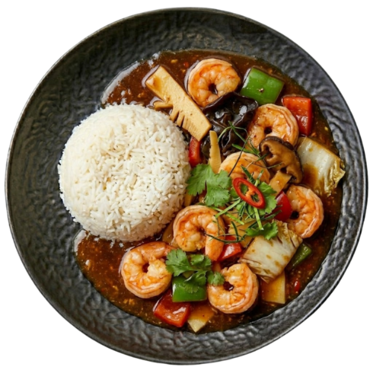 Garnelen mit chin. Pilzen, Bambus, Paprika Chinakohl in Sauce Papikiu mit einer Portion Reis