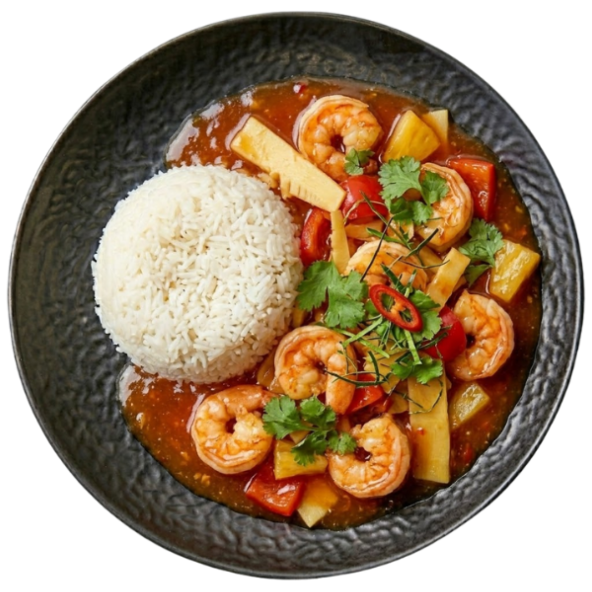 Garnelen mit Bambus, Paprika, Ananas in Süß-Sauer-Sauce dazu eine Portion Reis