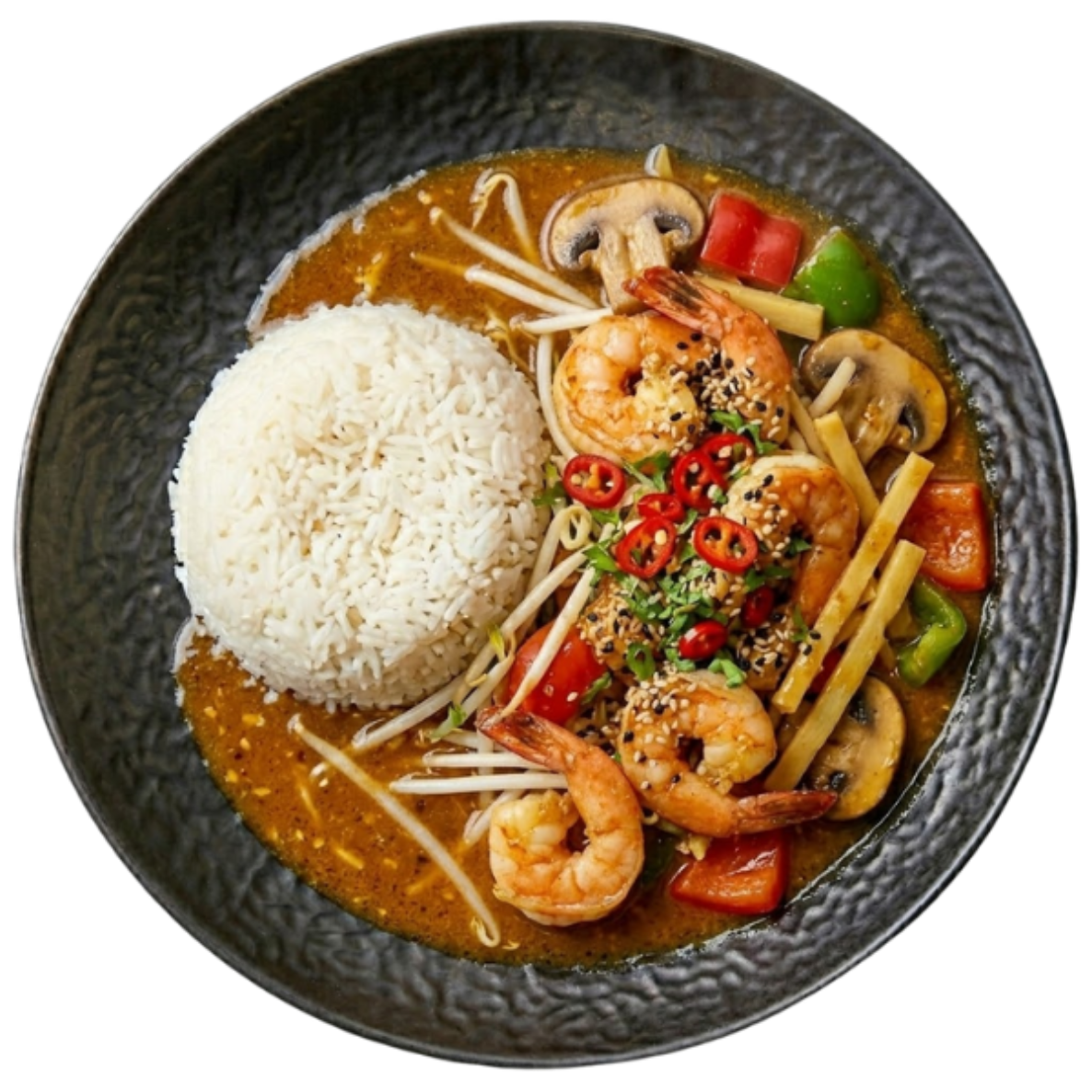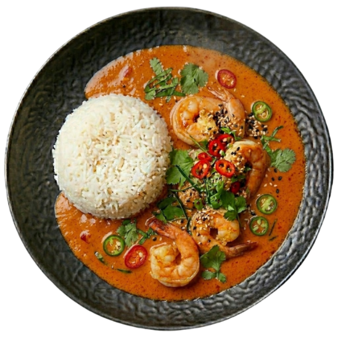 Garnelen mit rot-Thai-Curry (scharf) mit einer Portion Reis