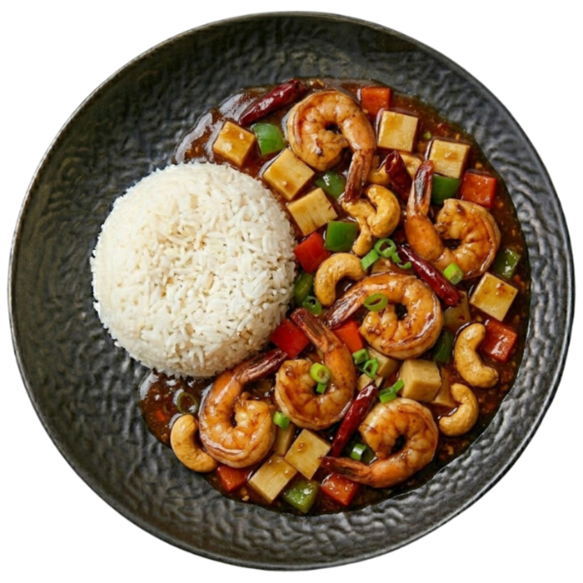 Garnelen mit Bambuswürfeln, Paprika Cashewkerne . Kung Pao Art (scharf)