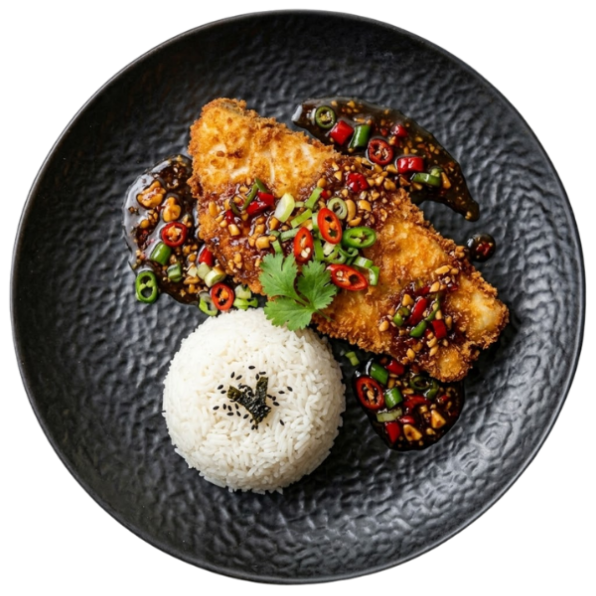 Fischfilet (paniert) mit Soja- und Erdnuß-Chili-Sauce (scharf) dazu eine Portion Reis