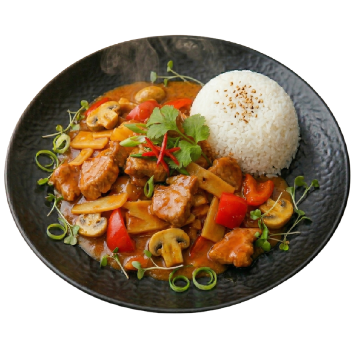 Schweinefleisch mit Champignons, Bambus, Paprika in Currysauce dazu eine Portion Reis