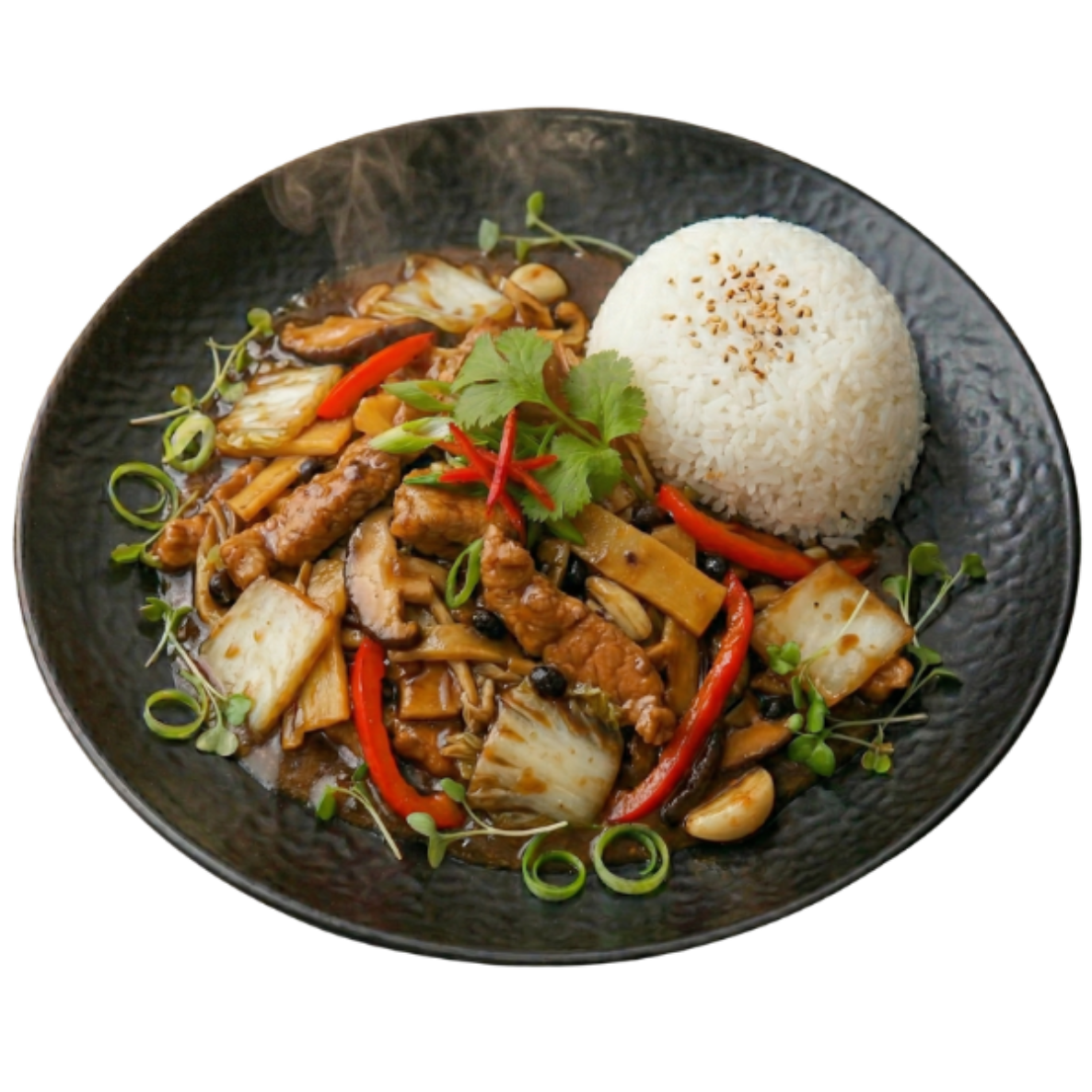 Schweinefleisch mit chin. Pilzen, Bambus, Paprika, Chinakohl in Sauce Schwarzbohnen (scharf) dazu eine Portion Reis