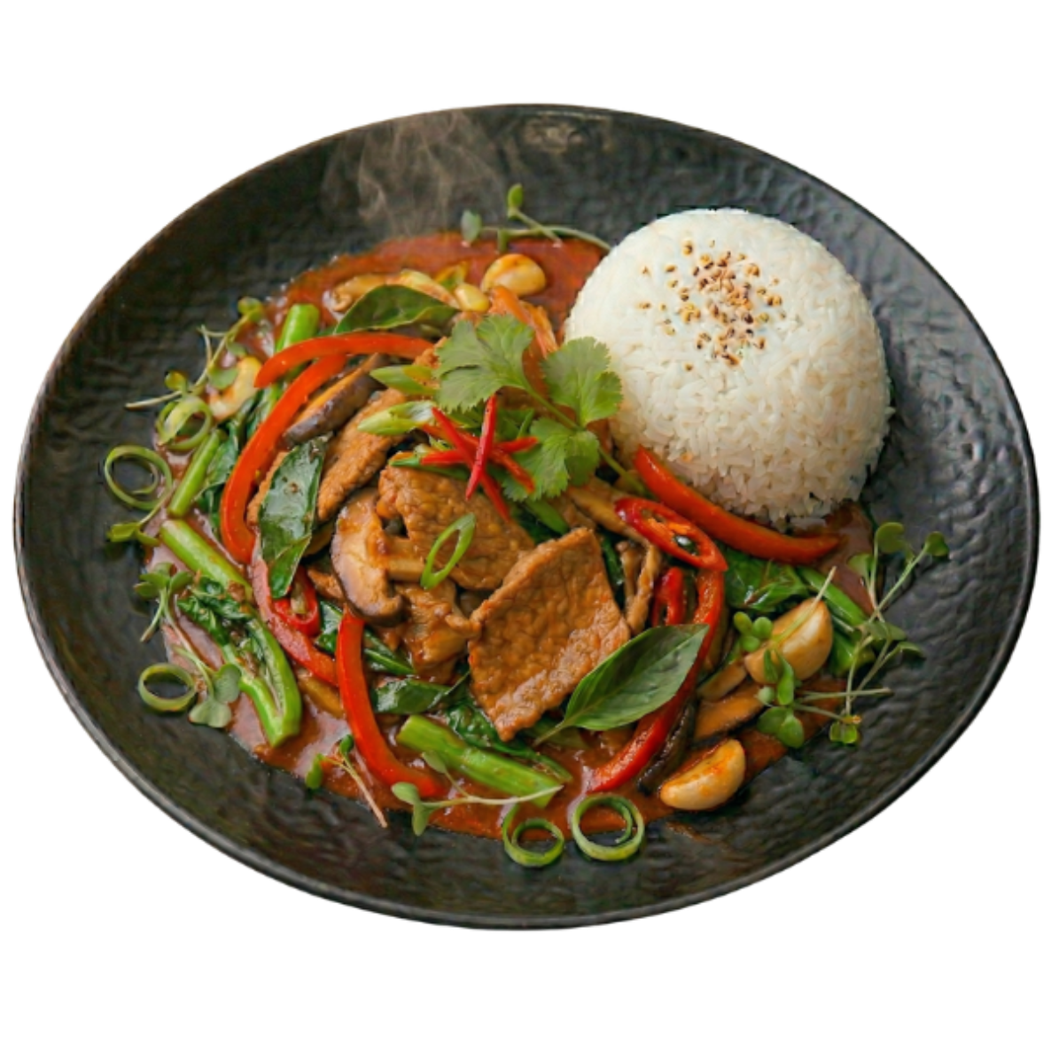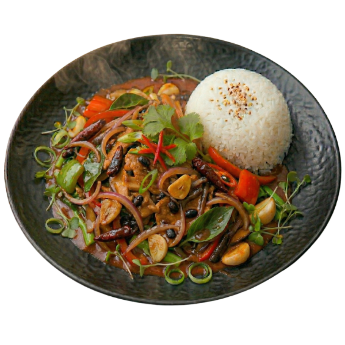 Schweinefleisch mit rot-Thai-Curry (scharf) dazu eine Portion Reis