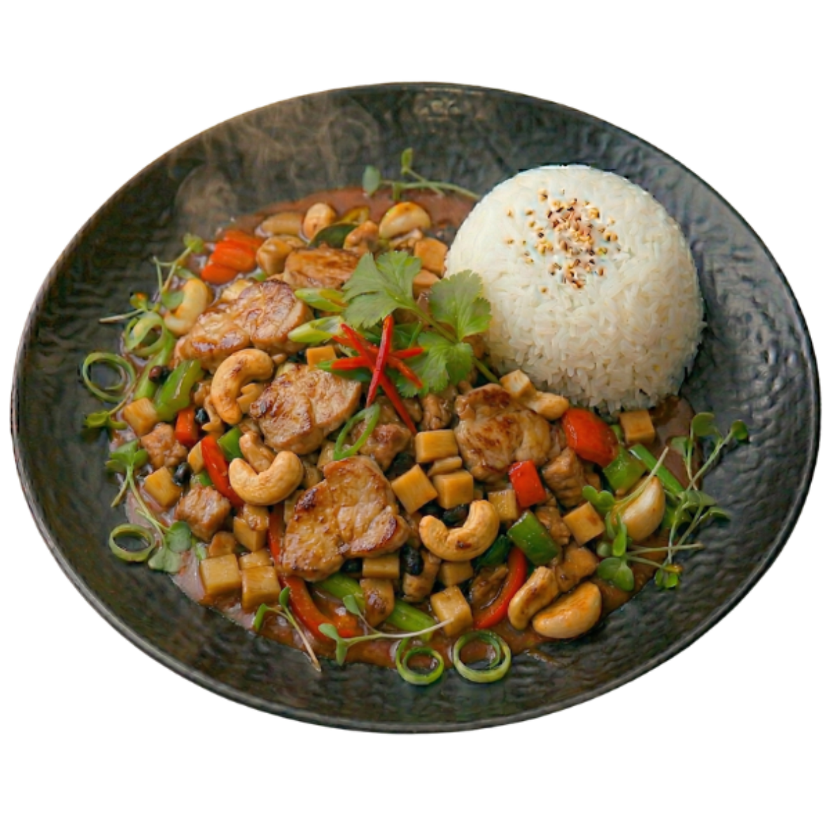 Schweinefleisch mit Bambuswürfeln, Paprika, Cashewkerne nach Kung Po Art (scharf)