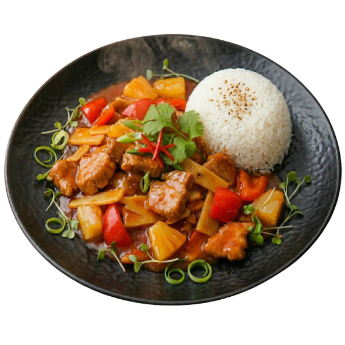 Schweinefleisch mit Bambus, Paprika, Ananas in Süß-Sauer-Sauce dazu eine Portion Reis