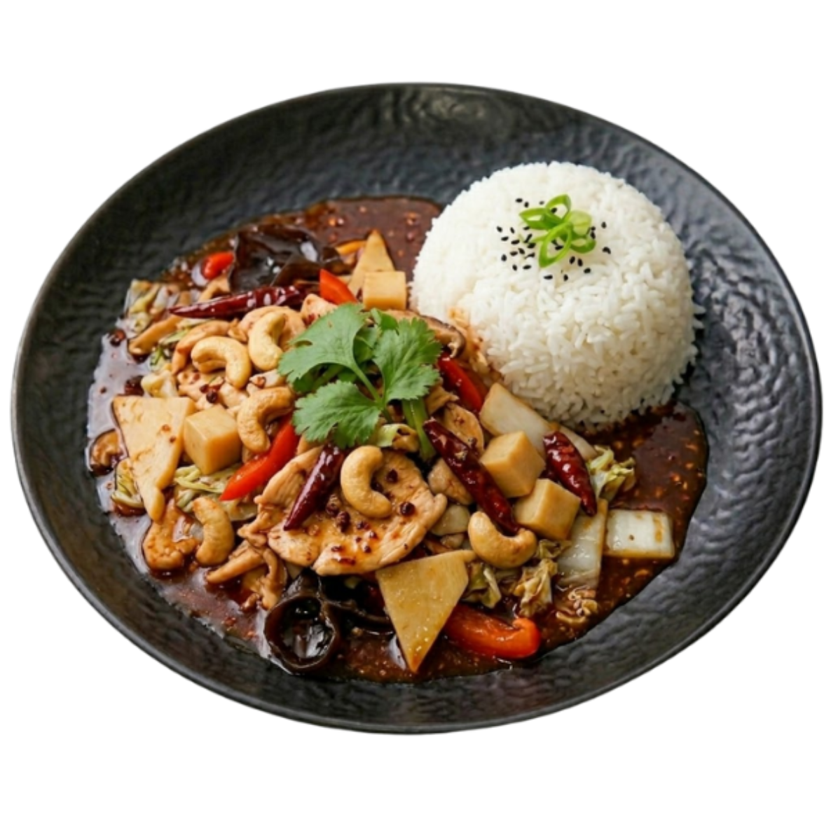 Hühnerfilet mit Bambuswürfeln, Paprika, Cashewkerne nach Kung Po Art (scharf) dazu eine Portion Reis
