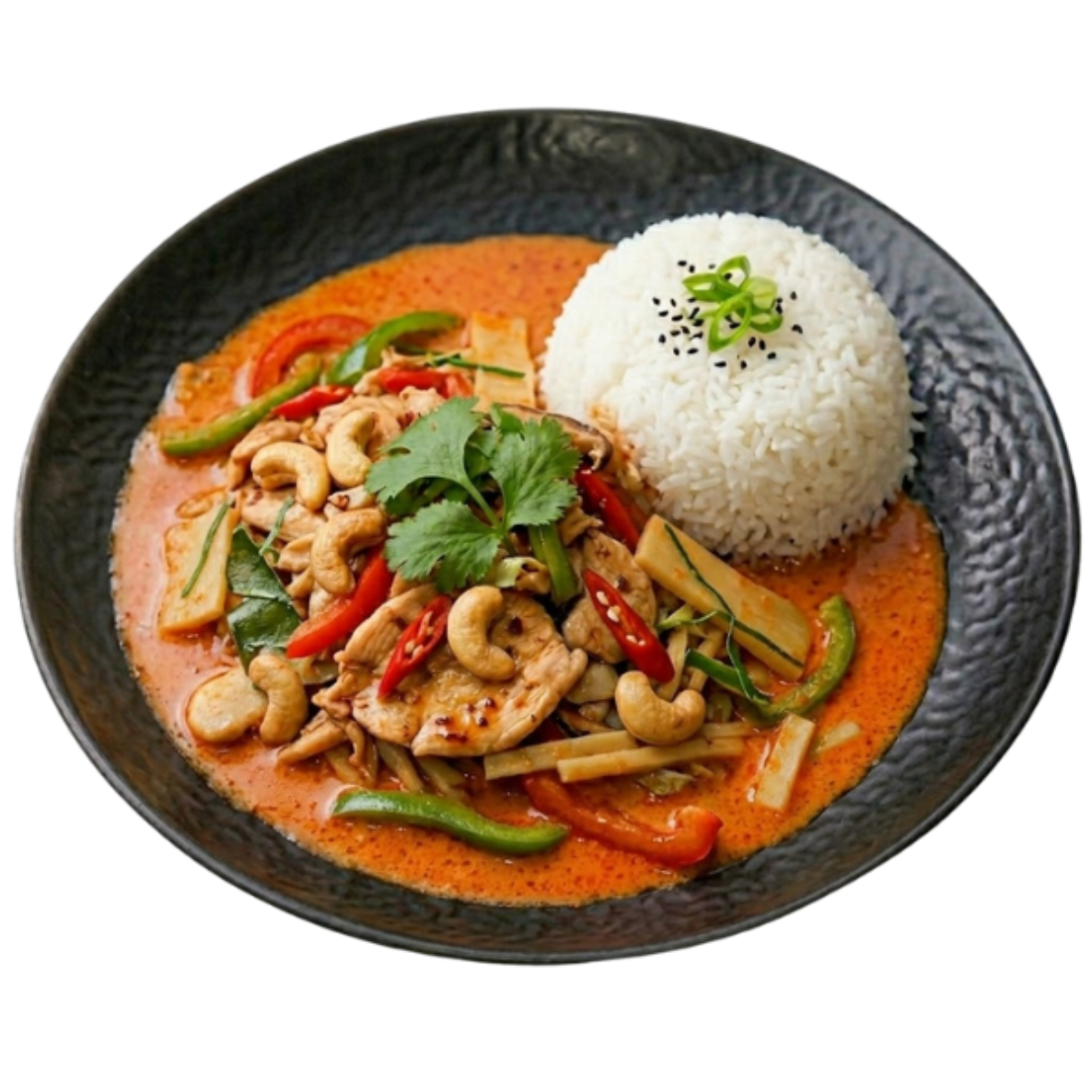 Hühnerfilet mit Champignons, Bambus, Paprika in Currysauce (scharf)