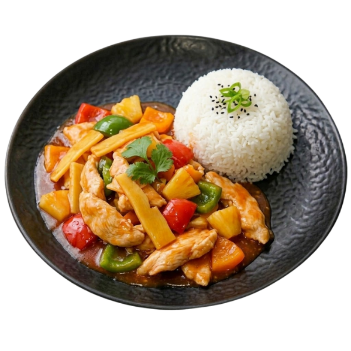 Hühnerfilet mit Bambus, Paprika, Ananas in Süß-Sauer-Sauce dazu eine Portion Reis
