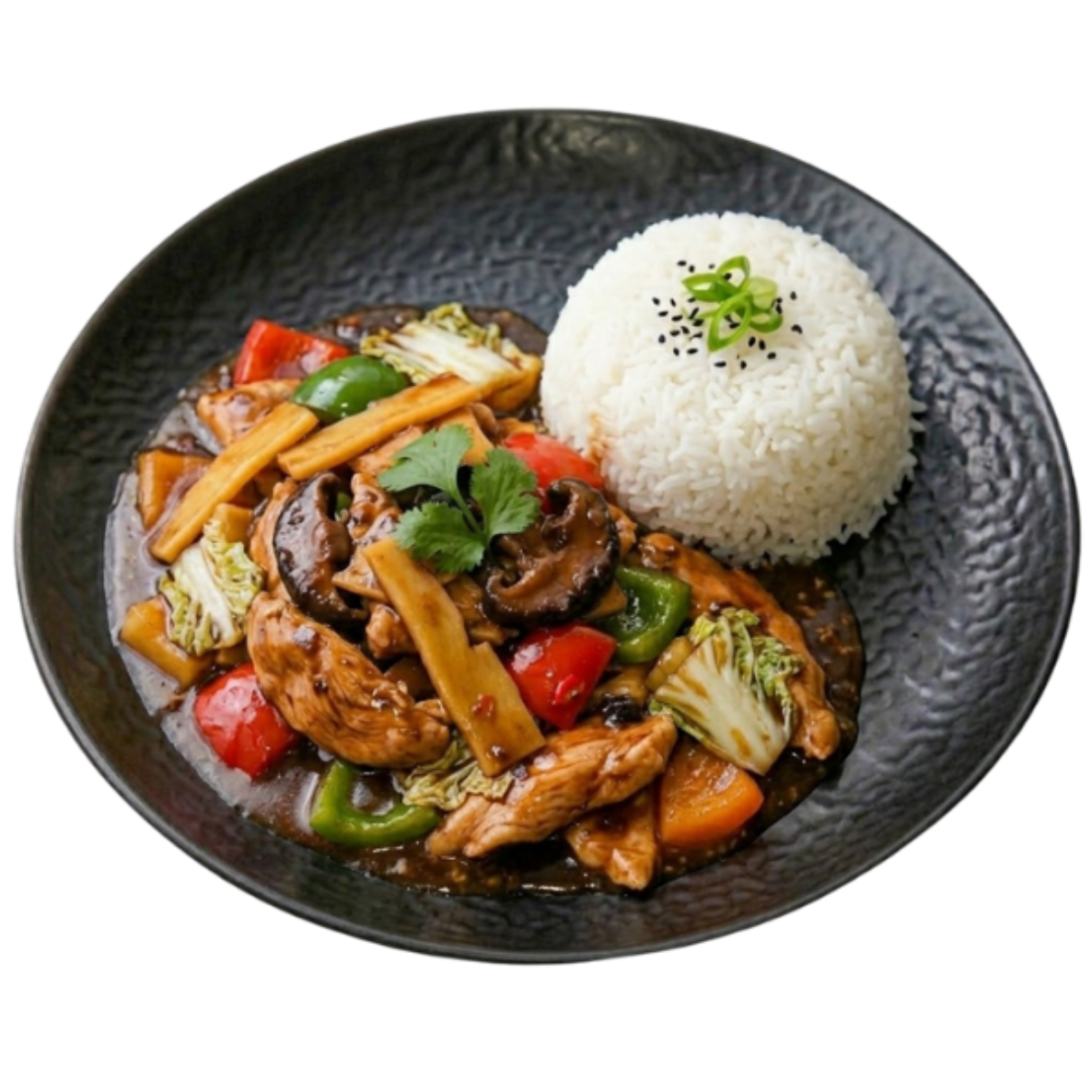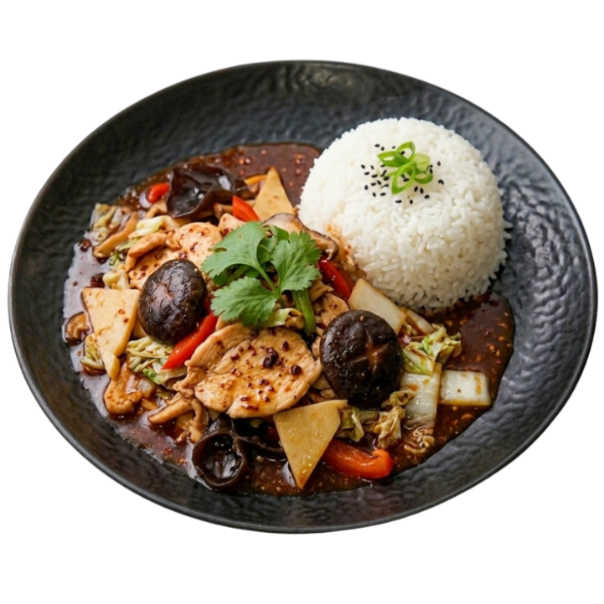 Hühnerfilet mit chin. Pilzen, Bambus, Paprika, Chinakohl in Sauce Schwarzbohnen (scharf) dazu eine Portion Reis